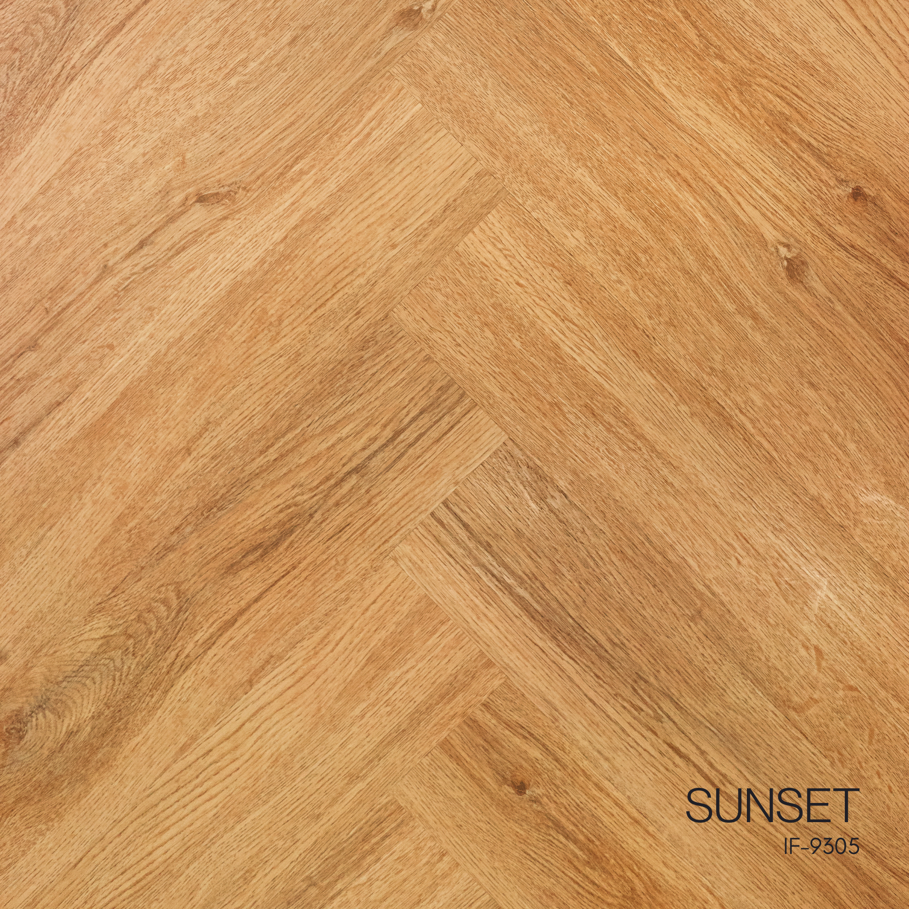 Sunset Herringbone SPC features warm golden-brown tones that add richness and depth to interiors. Its durable stone core and realistic embossed grains ensure excellent water resistance, stability, and enduring elegance.